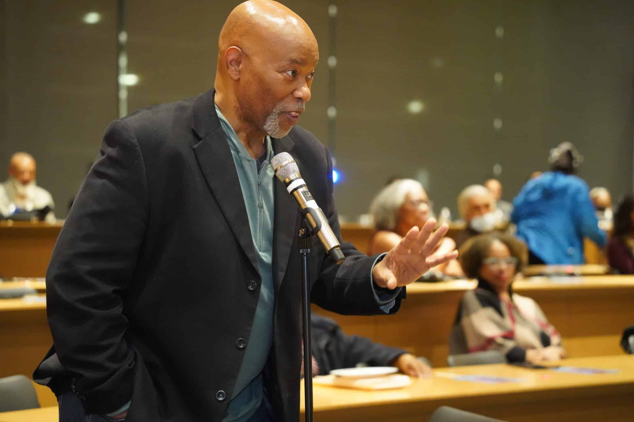Clevelander Phil Davis poses a question to the panel.